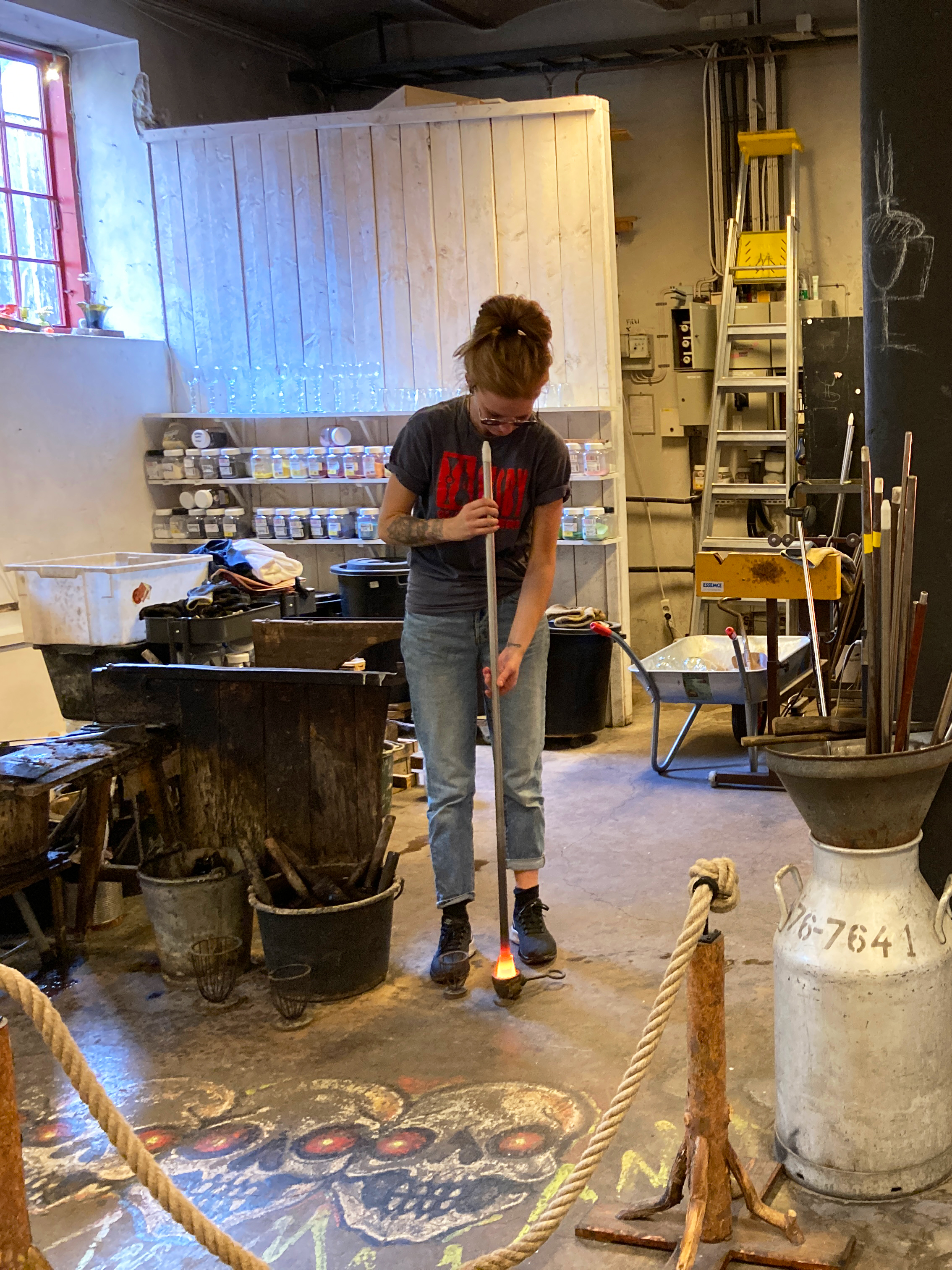 Ein paar gekalkte Holzwände mit Regalen, ein schlichter Tresen. Dahinter, Öfen mit einer Hitze im Inneren als käme sie direkt aus der Hölle. Der Verkaufsraum der Glasbläserei ist zugleich Werkstatt.