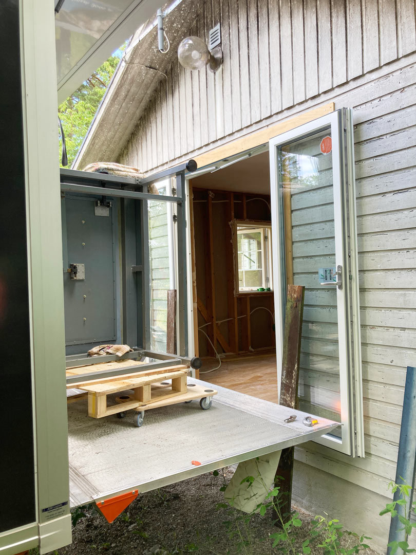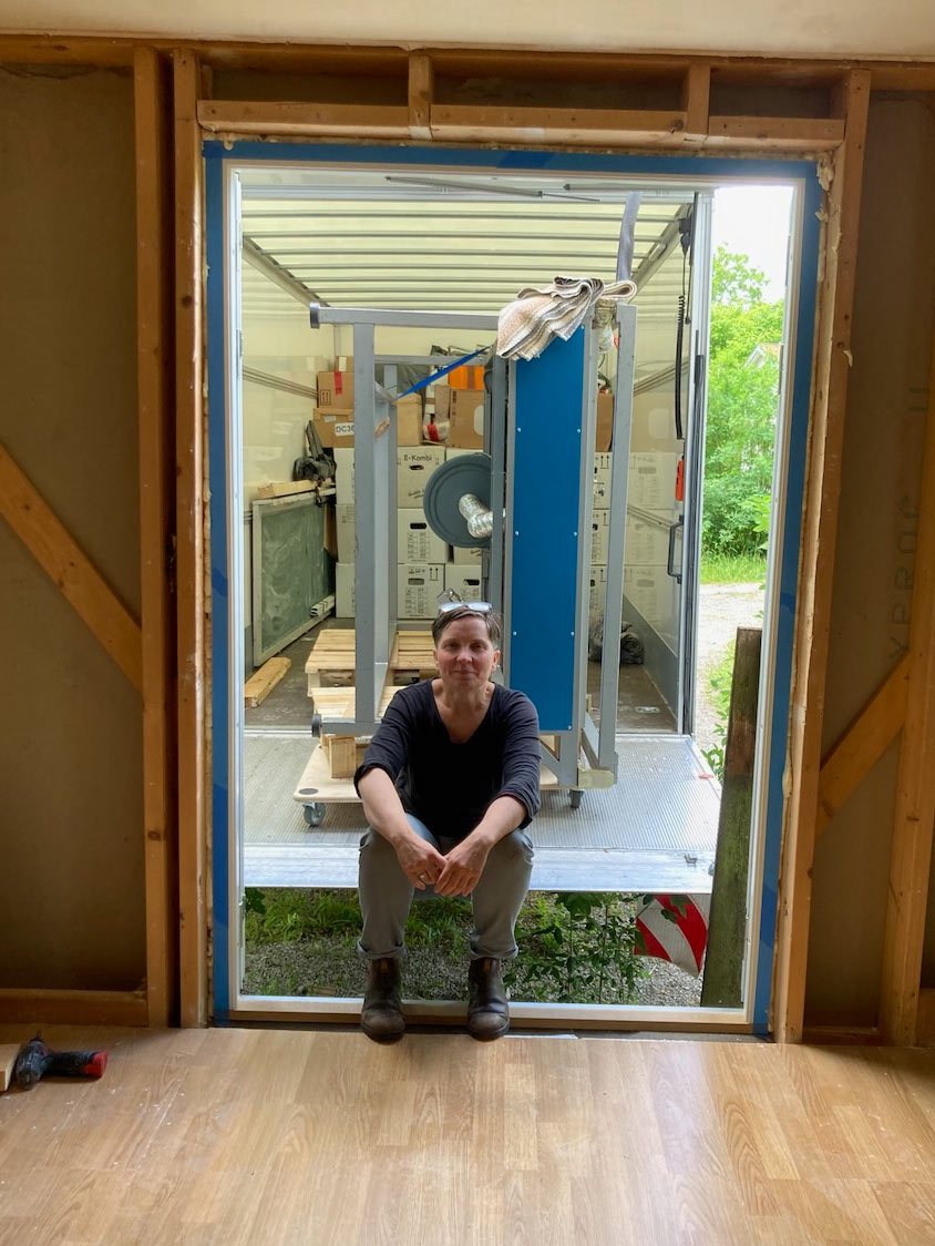 Für das Ausladen auf der Insel hatte ich online zwei Helfer gebucht. Gotland hat einen großen Universitätscampus und folglich auch Student:innen, die einen Job suchen. Da im Juni die Doppeltür in das Atelier gebaut worden war, konnten wir also passgenau mit dem LKW heranfahren und die Wuchtbrumme Drucktisch ausladen. Geschafft! YEAH! Mir ist ein brutal großer Stein vom Herzen gefallen.