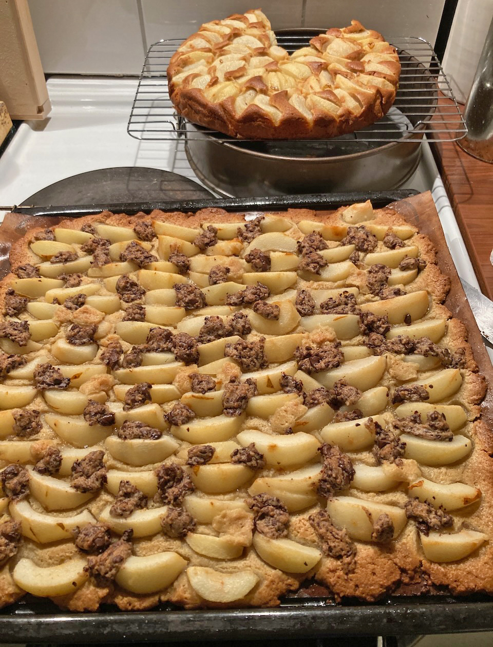 Apfelkuchen in der Form, Apfelkuchen vom Blech, mit Streuseln oder ohne. Apfelbrot – sehr lecker! – Apfelmarmelade mit Zimt oder ohne. Birnenkuchen mit Walnüssen und Schokodale vom Blech – auch ein Genuss.