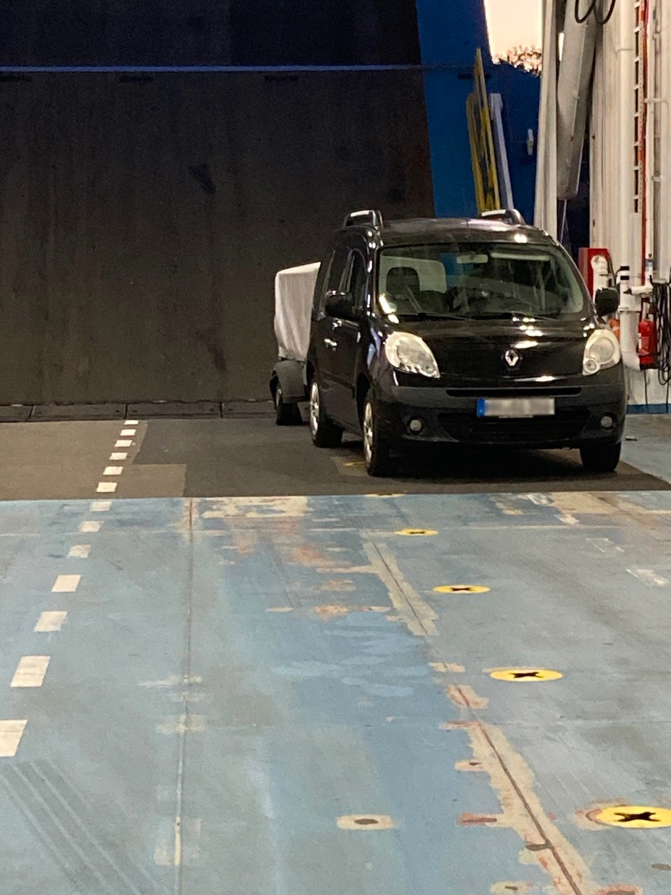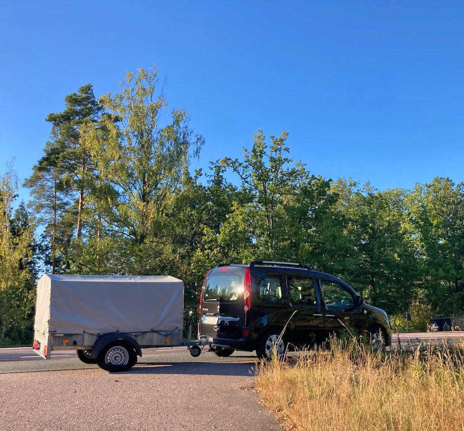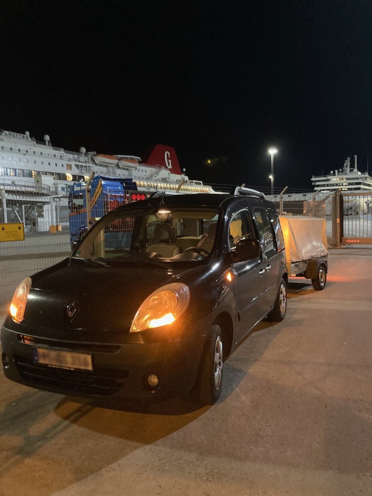 Als wir im Hafen ankamen, stellte sich heraus, dass es keinen passenden Reifen zum Wechseln gab – das deutsche Reifenmaß des Anhängers ist zu ungewöhnlich in Schweden. Das hat hier kein Mensch auf Lager. Schließlich durften wir mit Kangoo, LKW und Anhänger durch den Check-in bis zu den Warteschlangen an der Fähre fahren, wo der Abschleppmensch den Hänger ablud und – meiner absoluten Dankbarkeit sicher – verabschiedete. Ich nehme an, wir boten den zahlreichen Wartenden, die um uns herum in ihren Autos saßen, eine willkommene Abwechslung. Als dann irgendwann restlos alle PKW und LKW auf die Fähre gefahren waren, durfte ich – unter den mitleidsvollen Blicken des Fährpersonals und diverser Passagiere oben an Deck – im Kriechtempo auf die Laderampe und die Fähre rollen. „Du musst unbedingt langsam fahren!“ hatte mir der Abschleppmensch noch eingeschärft. Klar, leuchtet ja ein, wenn der Hänger vollbeladen einseitig auf der blanken Felge rollt. Ich war jedenfalls froh, an Bord zu sein, auch wenn mein Auto einen etwas jämmerlichen Anblick bot. Ziemlich schnell kehrte auch mein Humor zurück, und die Müdigkeit. Im Sessel an Bord dämmerte ich ziemlich schnell weg. Das war auch ganz gut so, denn so hatte ich bei der Ankunft drei Stunden später wieder ausreichend Nerven, um erneut im Kriechtempo und als allerletzte von der Fähre herunter und aus dem Hafengelände heraus zu rollen.