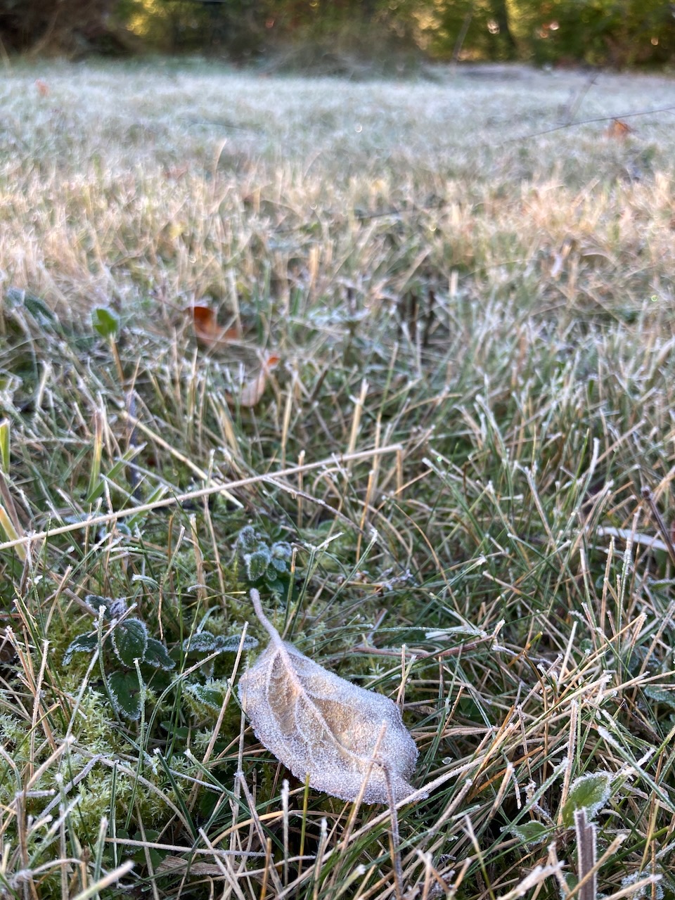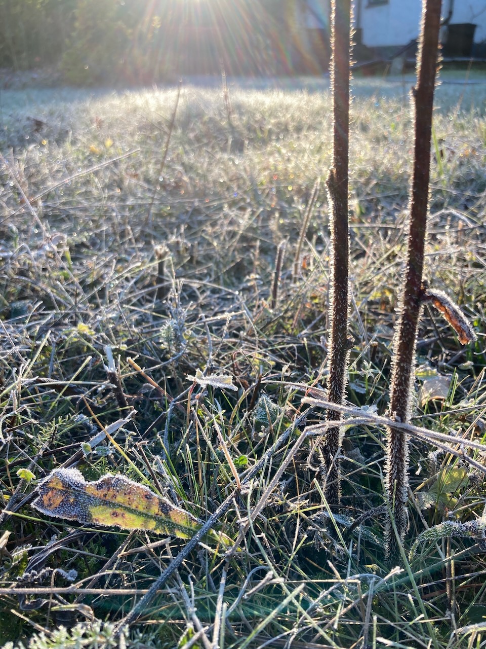 - Am letzten Septembertag kam dann der erste Frost. Der Garten sieht einfach zu schön aus, wenn Gräser, Blätter und Blüten mit weißen Kristallen bedeckt sind, die in der Morgensonne glitzern.